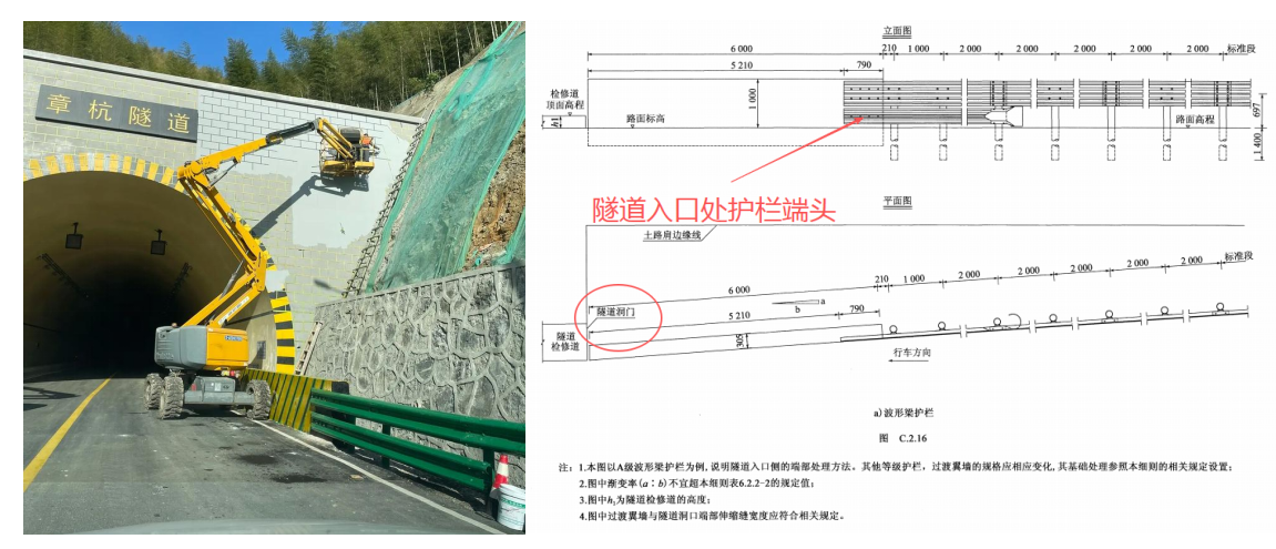 1) 隧道人口处的路侧波形梁护栏宜渐变向隧道延伸,在隧道洞口处设置与检修道断面相匹配的过渡翼墙。