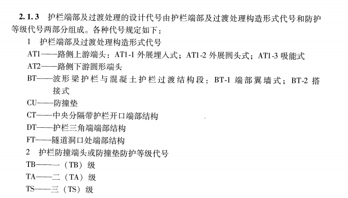 现行的公路护栏端头主要有7大类构造形式、3种防护等级。各护栏端头类型代号如下: