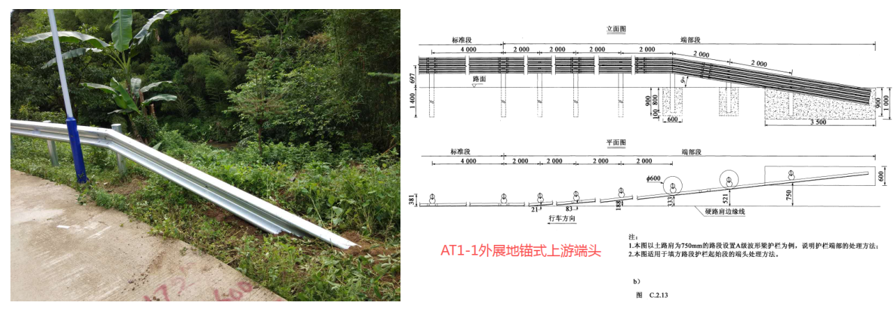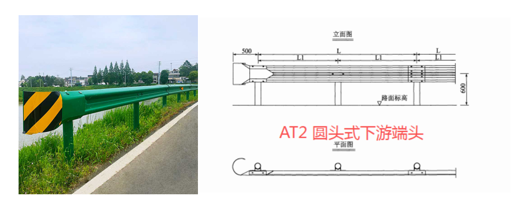 2) 行车方向下游端头可采用圆头式可与标准段护栏成一直线设置。二级公路考虑对向交通驶出路外碰撞的可能性,也可做成外展圆头式。