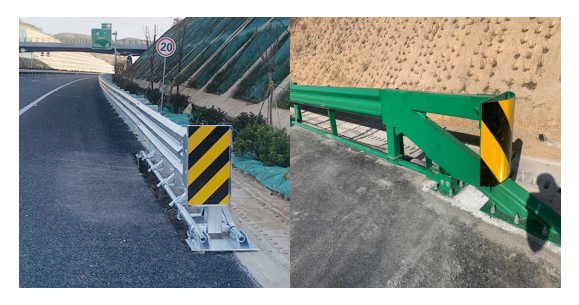 1) 行车方向的上游端头宜设置为外展圆头式、外展埋入式或吸能式,端头与护栏标准段之间应设置渐变段。