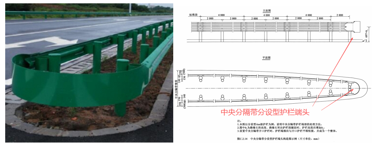 1) 标准路段采用分设型波形梁护栏时,其圆形端头及过渡段线形应与中央分隔带相一致,立柱间距为标准路段间距之半。