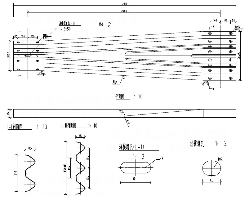 波形护栏过渡板是指在一些特殊的路段,需要同时使用双波形护栏和三波形护栏时,可以使不同规格的梁板连接在一起,能够流畅过渡的特殊护栏板。而双波护栏和三波护栏的截面是不一样的,在这种情况下就需要使用一种规格为(506-310)85*4320*3/4mm或(506-310)85*2320*3/4mm的过渡板。
