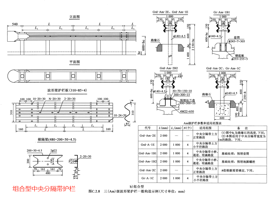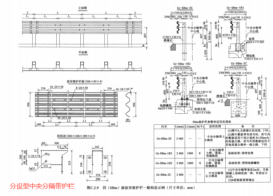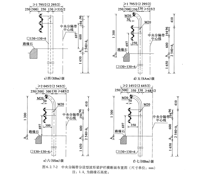 防护等级代码分别为Am、SBm、SAm、SSm、HBm级的分设型中央分隔带护栏的构造形式与代码分别为A、SB、SA、SS、HB级的路侧护栏基本相同。