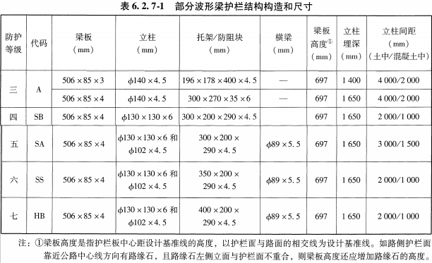 2)分设型波形梁护栏规格和尺寸应符合下表的规定: