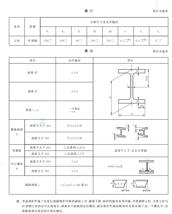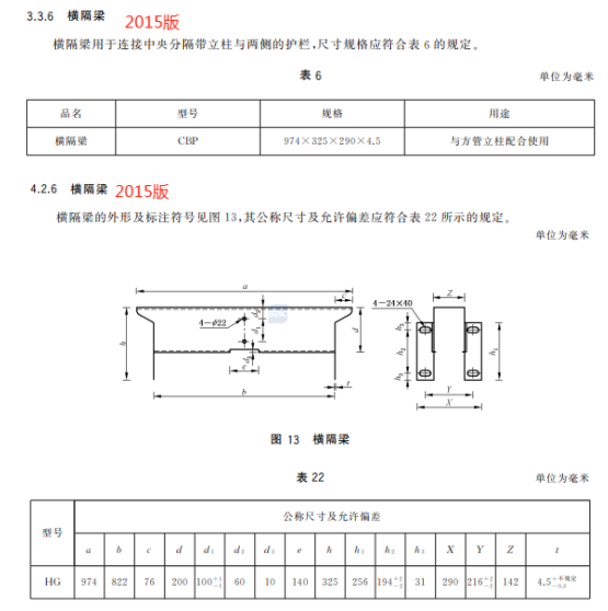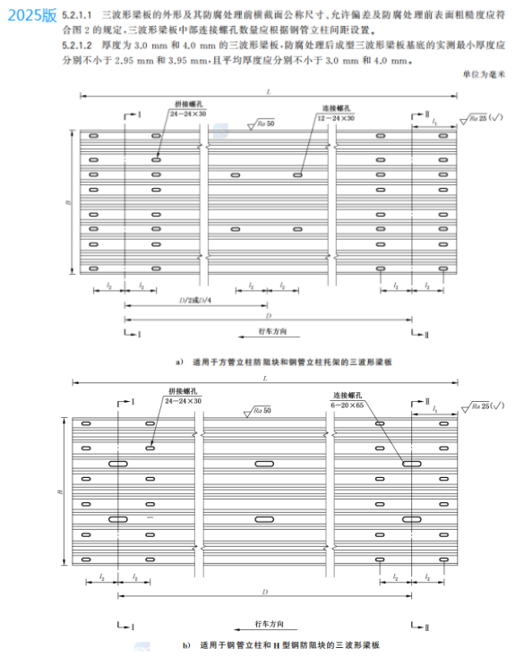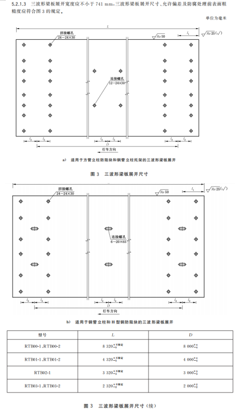 m) 增加了三波形梁板中部连接螺孔数量应根据钢管立柱间距设置的要求、展开尺寸及允许偏差的要求(见5.2.1.1~5.2.1.3);