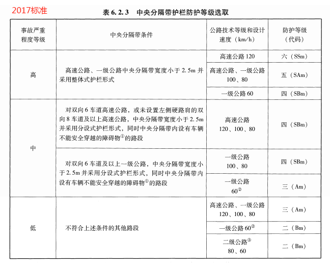 根据中央分隔带的条件,事故严重程度可分为三个等级:高、中、低。中央分隔带护栏的防护等级应符合6.2.3 的规定。