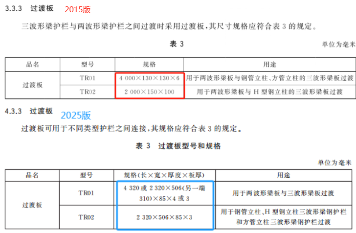 3、两波护栏与三波护栏之间的过渡板在规格、尺寸上也做了较大的变动。说实话,从业这么多年,光顾着埋头报价了,也可能还是见的少,就没见过哪个图纸的过渡板是15版那个规格的,最近整理规范标准才发现,有时间还是要多多学习呀!