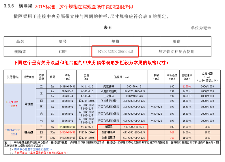 4、原2015三波护栏标准中的横隔梁删去,现行的有关中央分隔带横隔梁的标准可以参考:团体标准T/CCTAS162—2024《公路中央分隔带组合型波形梁护栏技术规程》;