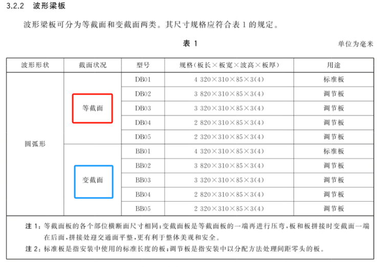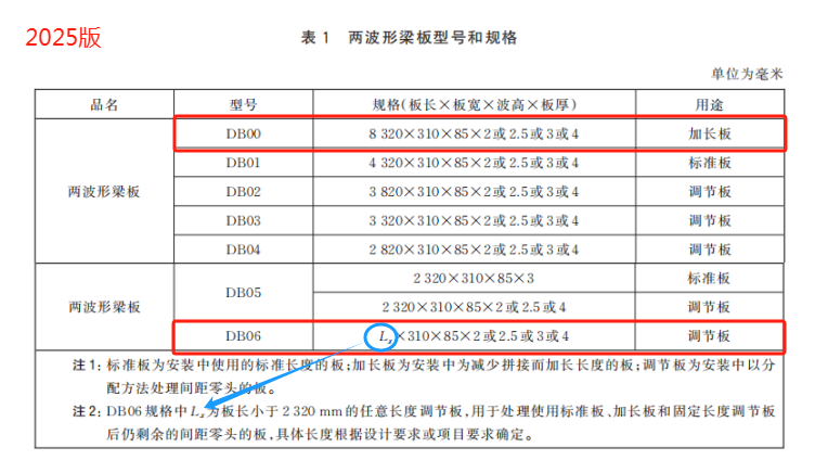 在即将实施的2025版标准中删除了变截面两波形梁板的外形图及加工要求,只保留了等截面板DB这一种板型,且增加了厚度2mm和2.5mm护栏板的最小厚度和平均厚度要求,更改了两波形梁板外形图、横截面公称尺寸、展开尺寸及允许偏差。
