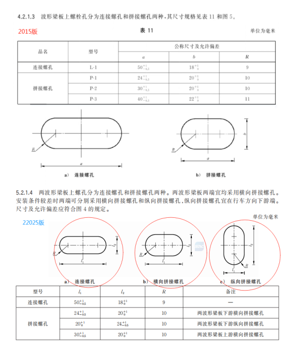 另外还更改了两波形梁板螺孔规格,增加了纵向拼接螺孔。2025标准要求安装条件较差时两端可分别采用横向拼接螺孔和纵向拼接螺孔,纵向拼接螺孔宜在行车方向下游端。